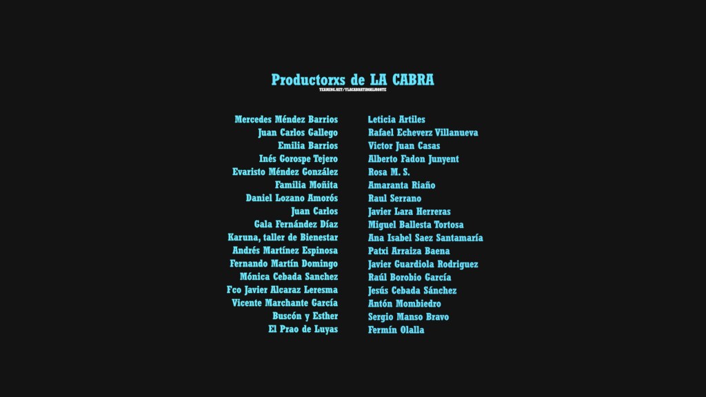 La serie, totalmente autoproducida, existe gracias a los Productorxs de la Cabra que hacen posible con su euro mensual este tipo de contenidos. Colabora en la producción PARAMONEGRO, el colectivo de dinamización cultural liderado por Cuke Martin, también con sede en Tabanera de Cerrato, como promotor del Flexágono.